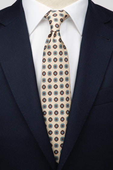 This tie is part of our exclusive line 'The Italian Collection'. The tie is designed in an exclusive and complex weave with a beautiful artistic medallion pattern. It is woven, produced and handmade at one of the world's leading factories in Como, Italy - a factory that has specialized in producing this type of tie since 1871.