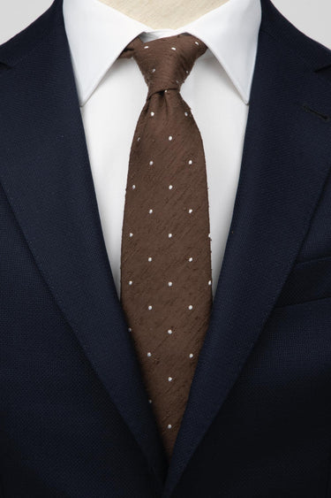 This Shantung tie comes in a deep brown base color that is broken by an elegant white dotted pattern.