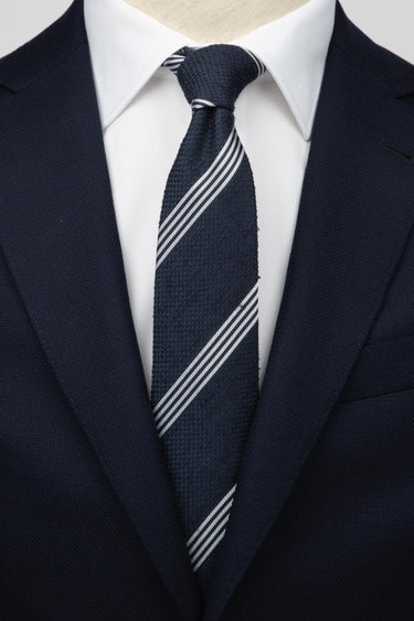 This Shantung tie comes in a deep blue base color that is broken by an elegant white striped pattern.